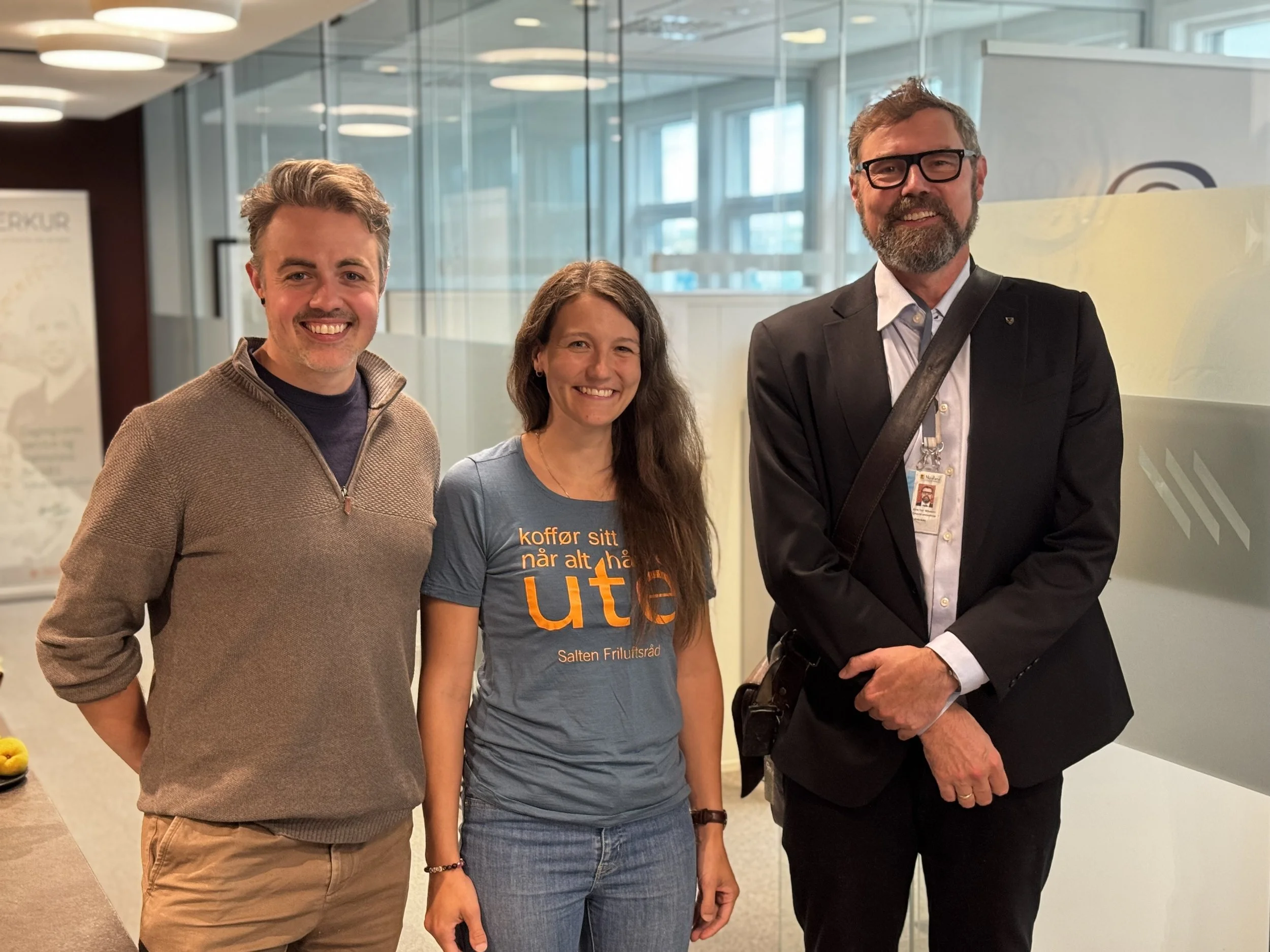 Fra v. Steinar Pleim Johansen (faglig leder Salten Kultursamarbeid), Annette Hals (faglig leder Salten Friluftsråd), og Arne Ivar Mikalsen (fylkesråd for samfunn, kultur og miljø)